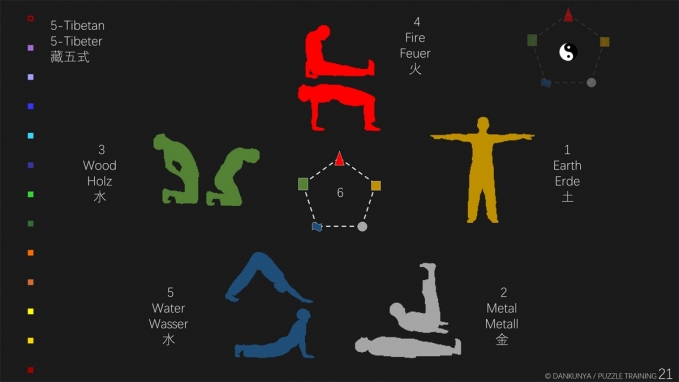 The 5-Tibetans are body exercises and harmonize in their movements with the Vitruvian sound theory, offering helpful support through personal responsibility for healing.