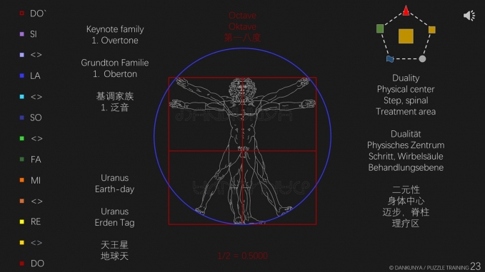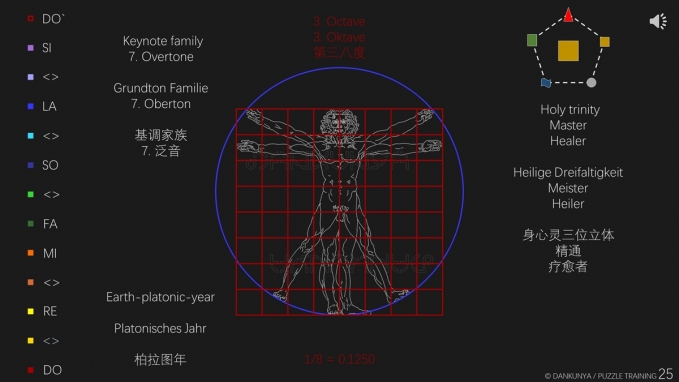 Leonardo Da Vinci's figure of the Vitruvian Man makes dimensional relationships with their meaning visible and playable via sound intervals.
